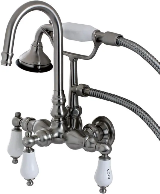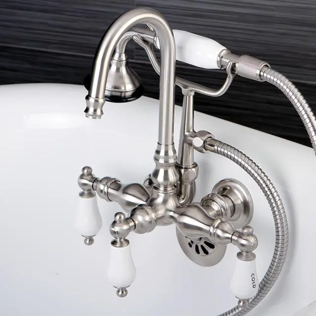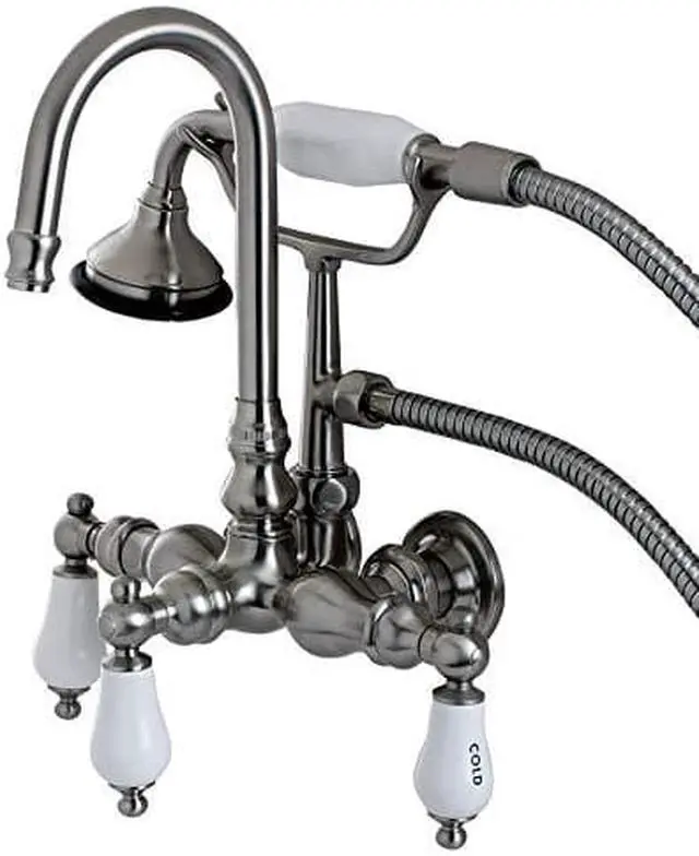 The Aqua Eden wall mount bathtub filler provides Vintage looks combined with outstanding performance and durability. With thee elegant porcelain lever handles- this clawfoot tub faucet features a high arc -J- spout and a traditional telephone style hand shower. Complete the look of your clawfoot tub with this faucet which installs on 3-3/8- centers on the wall of the tub. Obtainable in 4 tarnish and corrosion resistant finishes: Polished Chrome- Polished Brass- Oil Rubbed Bronze or Satin Nickel.