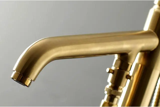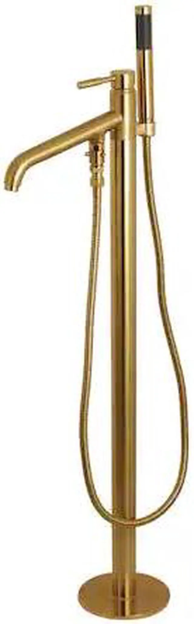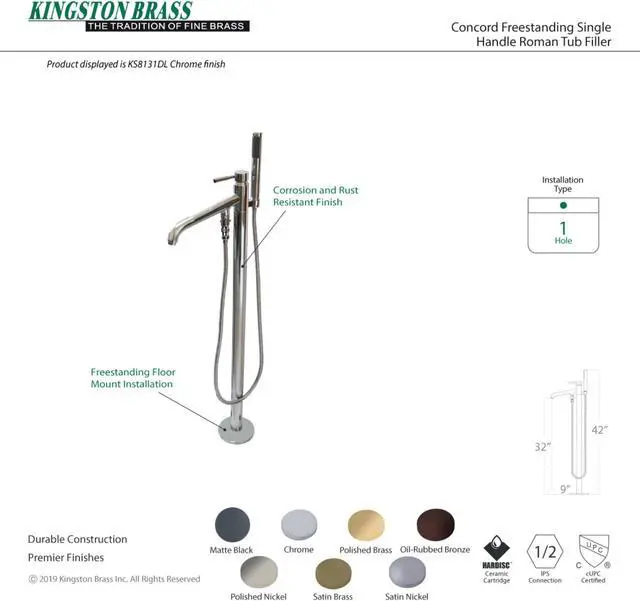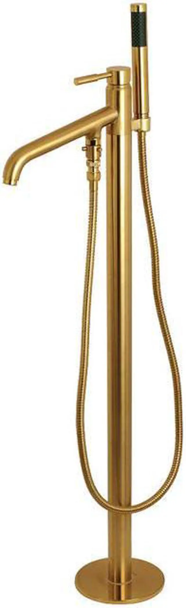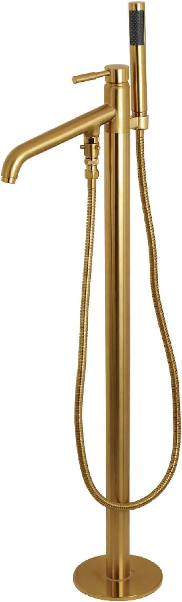 With its modern design and smooth lines- the Kingston Brass Concord Pillar Tub Filler is designed with contemporary influences in mind. Standing at 42 inches tall- this tub filler is meant for floor mount installation. The spout slopes gently downward to provide an excellent filling position and with a spout reach of 9 inches. The personal hand shower gives you the option to wash a selected area and is connected to a 59 inch hose for an extended reach. The single lever control activates water flow easily and the faucet features use of a ceramic disc cartridge for outstanding performance. With solid brass construction- this freestanding tub filler will be both durable and reliable and is suitable for contemporary and transitional decor styles.