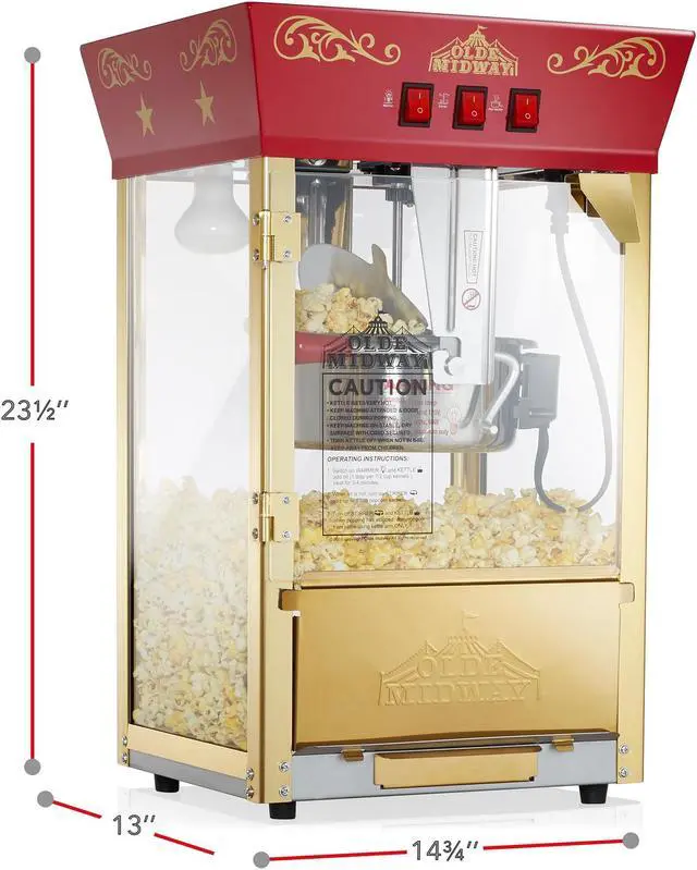 Enjoy making gourmet, movie theater-style popcorn anywhere with Olde Midway's tabletop popcorn machine. Offering nostalgic charm with a vintage design, this 850-watt popcorn machine has a powerful whisper quiet motor and completely modernized features for convenient, easy operation, and lasting functionality. The 8-ounce kettle can produce about 3 gallons of popcorn per batch to satisfy large crowds.