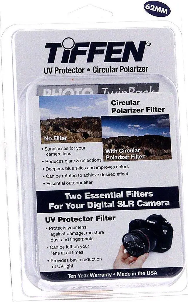 The kit features two of Tiffen's most popular filters - a UV Protection Filter and a Circular Polarizing Filter. The UV Protection Filter is designed to shield your camera lens from dust, scratches, and harmful ultraviolet rays, reducing glare and haze for clearer, sharper images. On the other hand, the Circular Polarizing Filter works to increase contrast and saturation, adding depth and richness to your photos.