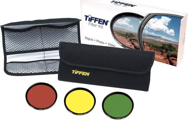 Explore the world of monochrome photography with Tiffen's Black & White Filter Kit. This comprehensive kit includes professional-grade filters specifically designed to enhance your black & white photography experience. The kit features a Red #25 filter, a Yellow #6 filter, and a Green #13 filter, each serving a unique purpose.
