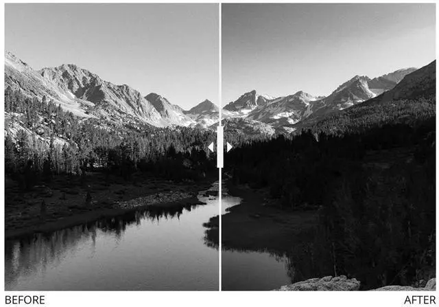 With infrared film, the filter gives extreme contrast to skies, turning foliage white and cutting through fog and haze.