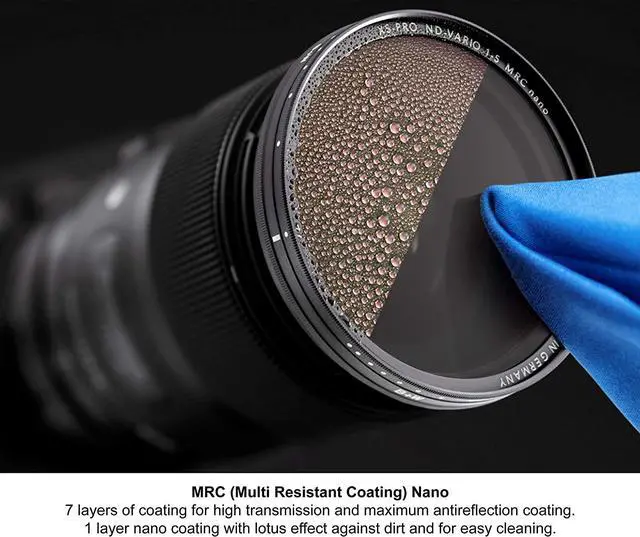 The nano coating is an outer layer of protection that comes standard with all XS-Pro Digital MRC filters. The nanotechnology based characteristic (lotus effect) produces a better beading effect with water making the cleaning of this filter even simpler and faster than ever before. MRC nano has an improved outer (8th) layer over regular MRC. MRC by B+W is not only an extraordinarily effective multiple layer coating, it is also harder than glass, so that it protects filters from scratches (for instance when cleaning the filters) and it is also water and dirt repellent, thus facilitating filter maintenance.