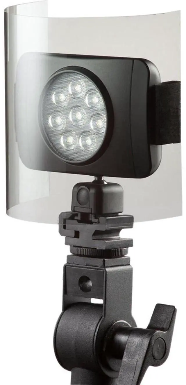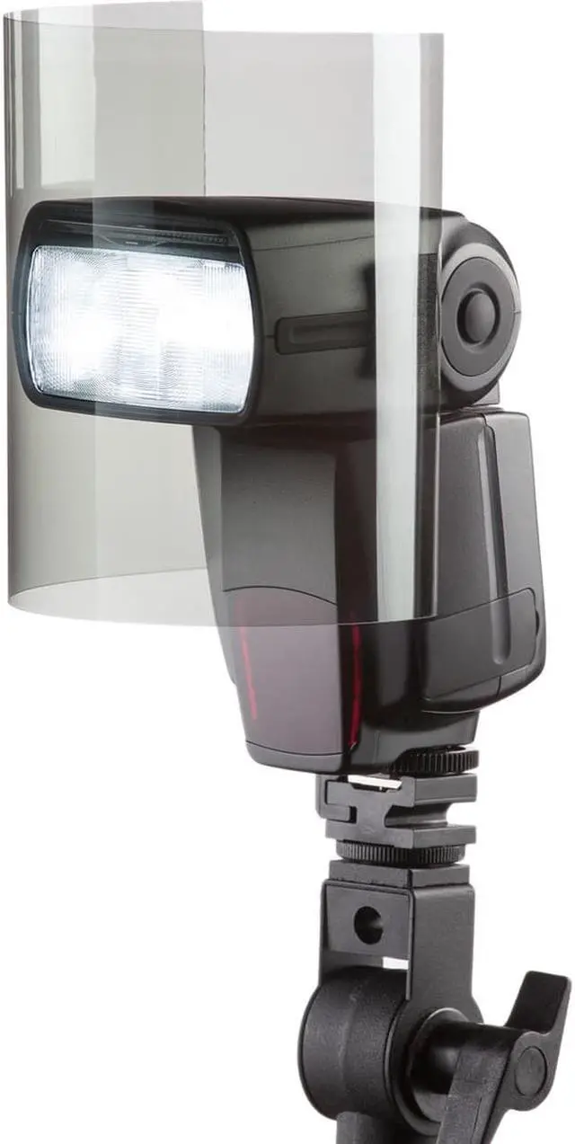 This works with flash units, LED photo lamps, flash systems and, due to of the heat generated, to a limited extent with repro lamps. The polarizing film can be easily cut to size or punched and is flexible. It is colorless and homogeneous.
