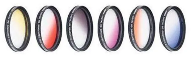Each of the filters are constructed from optical glass and set within rotating aluminum filter rings for controlling the placement of the color about the frame. The filter rings also feature front threads for attaching a lens cap or stacking additional filters for further creative effects. Product DetailsSix Different Graduated Color FiltersSelective Coloring to ImageOptical Glass ConstructionRotating Aluminum Filter RingsIncludes Fold-Up Filter Pouch