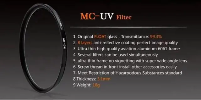 Ensure high light transmittance, highly smooth surface, avoid unnecessary reflection. Reduced internal reflection means sharper images and greater contrast. This professional MCUV filter is what digital cameras need.