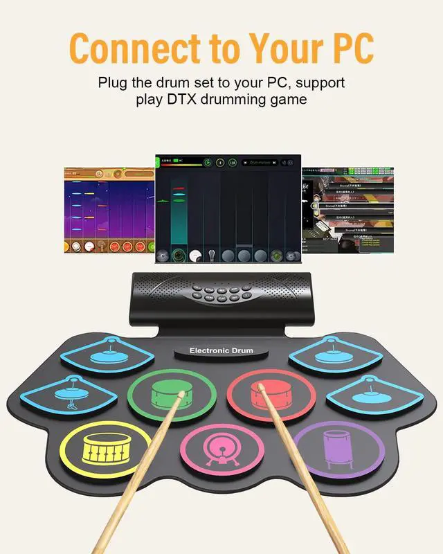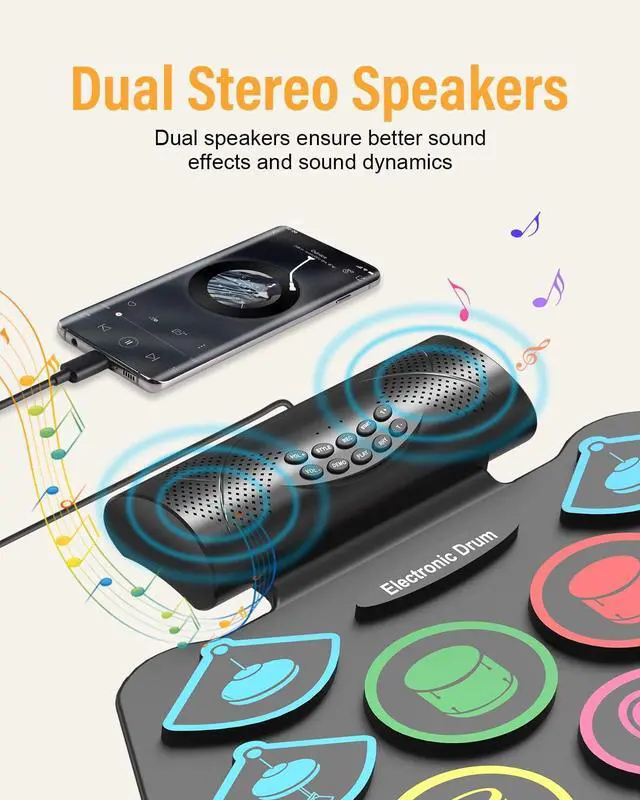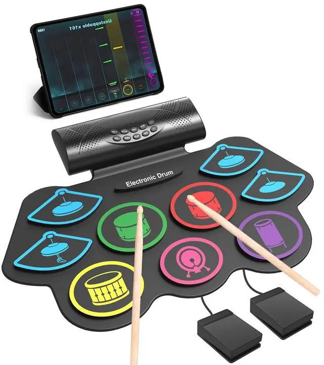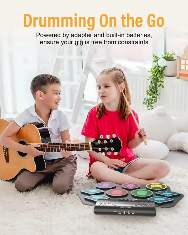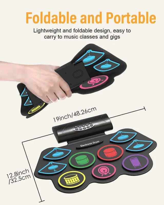 [Best Gifts for Kids and Beginners]Measuring 18.9'' x 12.8'', this roll-up drum pad is compact enough to fit easily into a backpack. Its flexible, durable, and space-savingperfect for storage or taking on the go. The 9 pads electric drum set that makes a great gift for kids, friends, or family on birthdays, Christmas, or any special occasion!