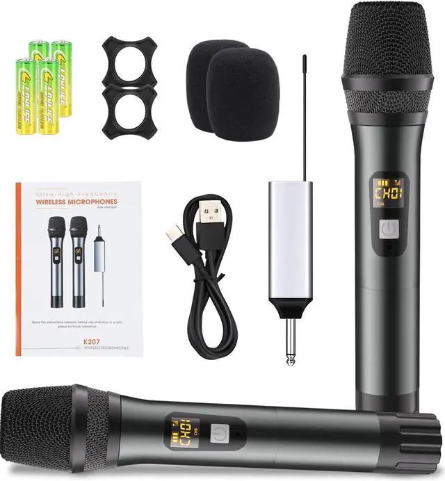 The rechargeable microphone receiver can work for 7-8 hours and takes 3-4 hours for a full charge. Single microphone requires 2 AA alkaline batteries (included).