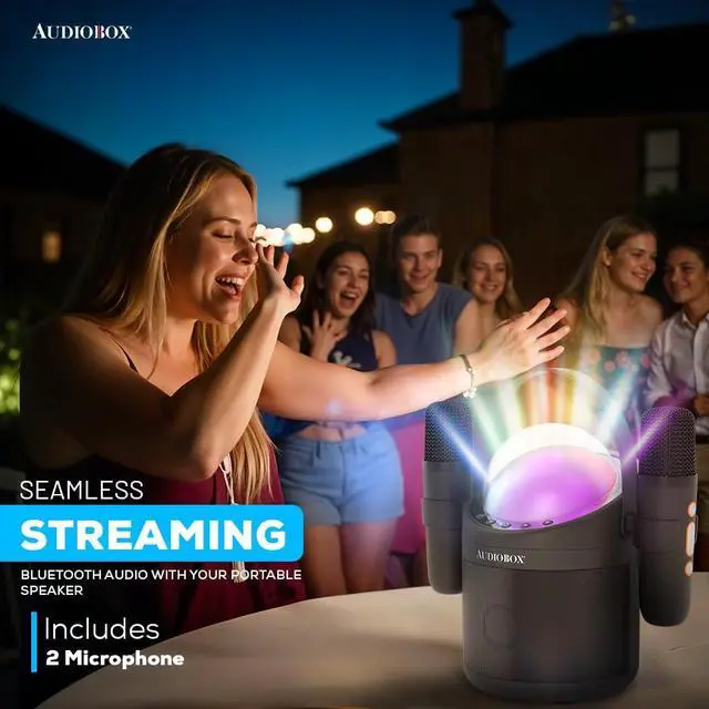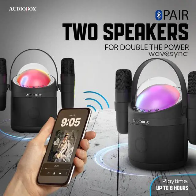 Turn any playroom into a stage with the Audiobox Mini Karaoke Machine. Featuring 2 wireless mics, voice effects, LED lights, and Bluetooth connectivity, it's perfect for kids' parties and family fun.