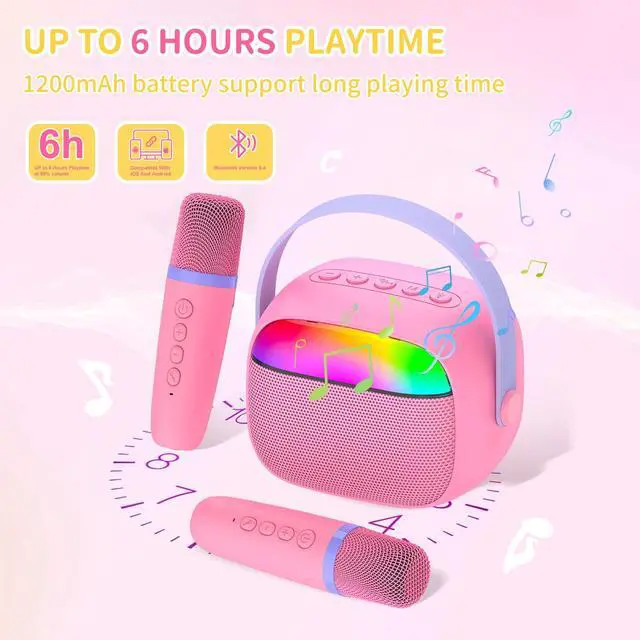 MINI KARAOKE MACHINE FOR KIDSThis kids karaoke machine with 2 wireless microphones, it's convenient for kids birthdays or other various parties to sing or have fun together!