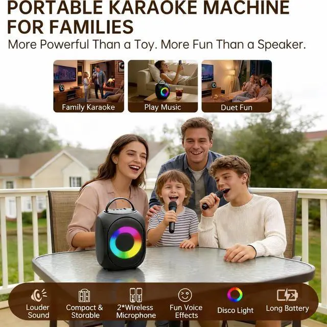 - [Easy-to-Use Portable Karaoke Machine Party Essential & Gift Ready]Designed for all ages: simple buttons, no learning curve. One button for power & pairing, one for effects and lightseasy enough for kids and seniors.Its stylish design and multi-function use make it an ideal portable karaoke machine for gifts, holidays, birthdays, and family gatherings.