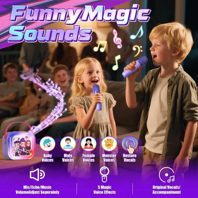 5 Fun Voice FX + Pro-Grade SoundThis kids' karaoke machine delivers studio-quality audio with powerful, distortion-free sound through high-performance drivers and DSP technology. Includes 2 wireless mics and 5 hilarious voice effects (Original/Male/Female/Monster/Baby) to spark creativity! Perfect for singing practice, talent shows, or costume parties.