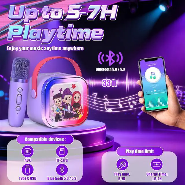 Portable & Long-Lasting This kids karaoke machine for girls is compact, lightweight, and easy to carry. Enjoy up to 6 hours of singing fun on a 2-hour charge perfect for car trips, camping, or parties!