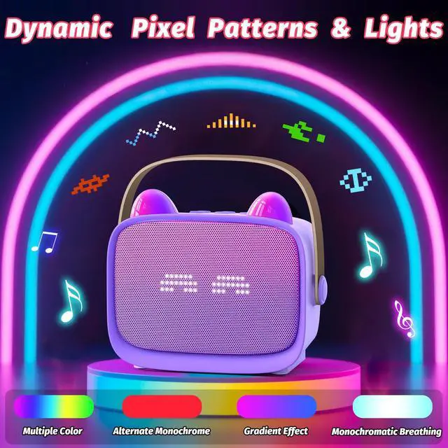 Transform Any Room into aParty! Unleash your child's inner superstar with our all-in-one portable karaoke machine! Designed for budding singers and family fun, this mini karaoke machine delivers professional features in kid-friendly packaging. Studio-Quality Singing Experience Dual Wireless Mics: Sync effortlessly for duets or group performances 1-Tap Vocal Removal: Instantly eliminate original vocals 4 Voice Effects: Female Voice, Male Voice, Doll Voice, Monster Voice DSP-Enhanced Audio: Dual noise cancellation + 360° surround sound Smart Connectivity Bluetooth 5.3: Ultra-stable pairing with phones/tablets/TVs 3 Playback: Bluetooth/TF Card/AUX input compatibility Party-Ready Visuals Dynamic RGB Lighting: 3 modes (gradient/breathing/steady glow) syncs to music 12 Mood-Boosting Patterns: Pixel art faces change with song rhythms Multi-functional Bluetooth speaker Hidden Phone Stand: Fits all smartphones for hands-free lyric viewing Pocket-Sized Portability: Take the party anywhere The Gift That Hits All the High Notes Perfect for: Birthday surprises, Christmas stockings and Confidence-building vocal practice.