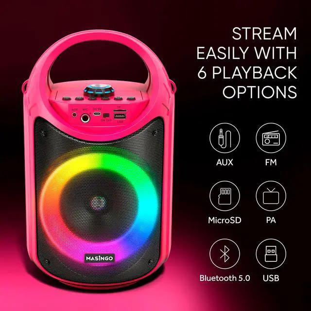 • Rock Where You Ramble - Lightweight build with a 2-hour rechargeable battery makes the C10 a snap to transport. This trendy Bluetooth karaoke speaker travels by handle or carry strap. Masingo machines are for karaoking anywhere in the USA and beyond.