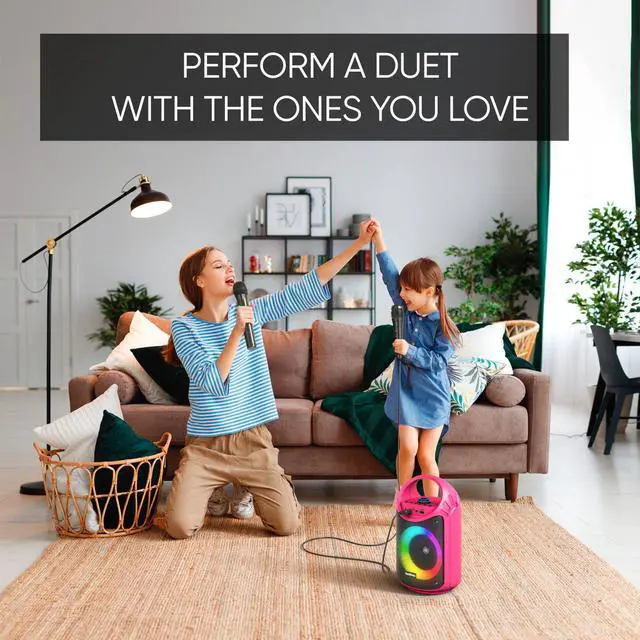 • Built for Together Time- This karaoke machine with 2 microphones includes a wired mike for popsolo power, and an external VHF karaoke microphone for karaoke duets. Sing solo, share a duet, or rap battle for the title of Karaoke King.