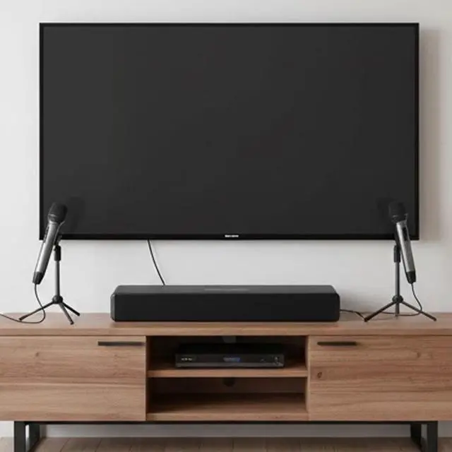 Karaoke Setup: Includes two wireless microphones for instant karaoke