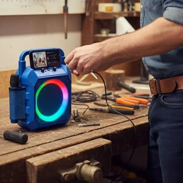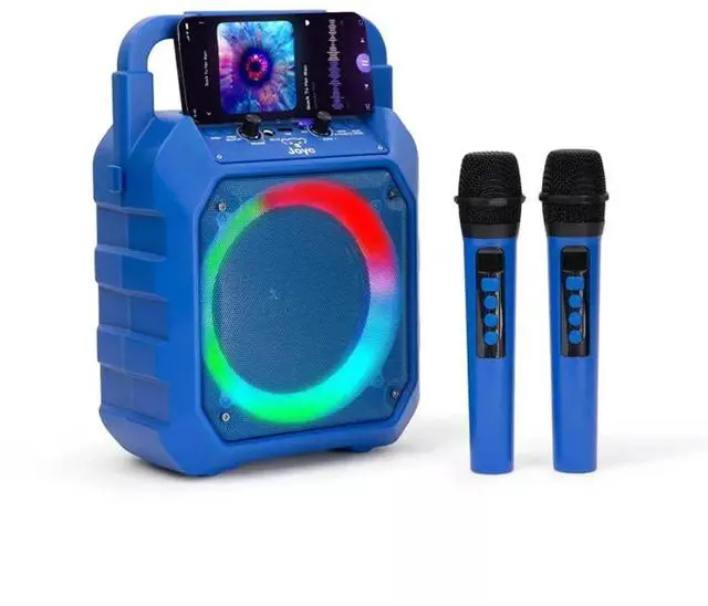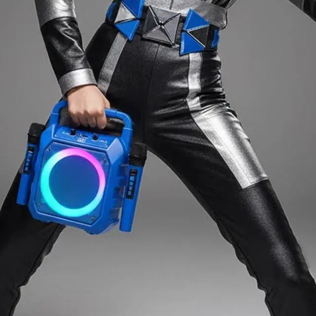Turn any event into a lively performance with this portable Bluetooth karaoke machine featuring two wireless microphones and vibrant RGB party lights. Lightweight and easy to carry, it delivers crystal clear sound with built in echo effects and voice changing modes for fun and interactive singing. Bluetooth connectivity allows seamless music streaming, while the rechargeable battery ensures hours of cordless play. Refurbished to like new condition and sanitized to meet manufacturer quality standards, this compact karaoke system is perfect for birthdays, family gatherings, or spontaneous sing along sessions.