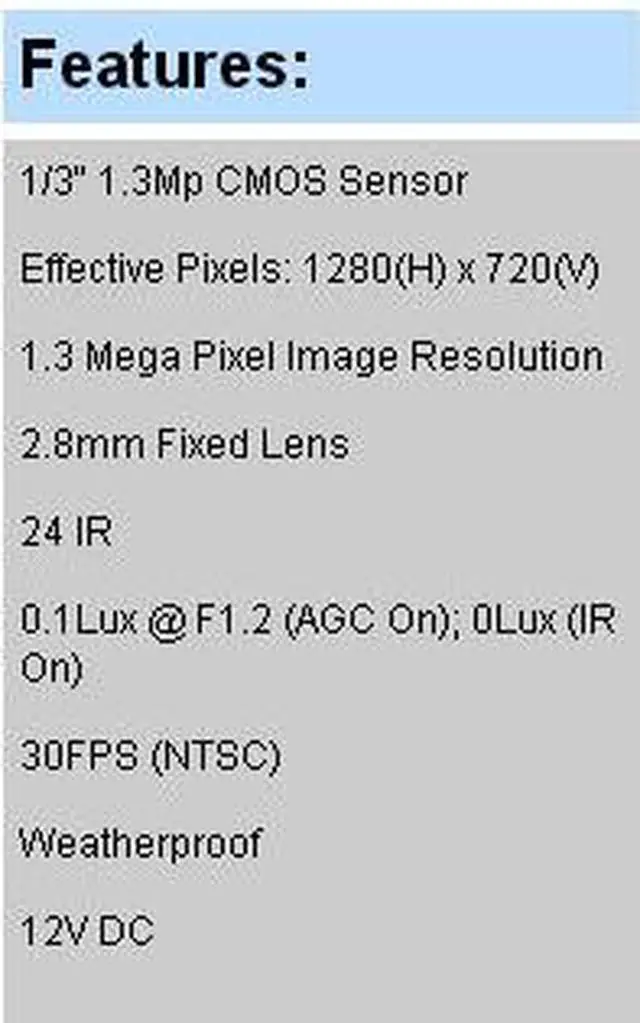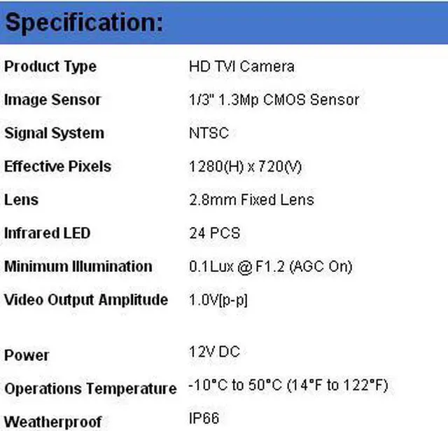1.3 Mega Pixel Image Resolution BL-TVI-IRD1M24-W-2.8MM 2.8mm Fixed Lens 12V DC 24 IR NTSC