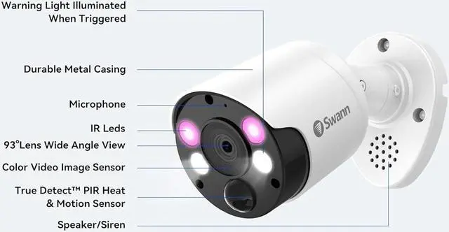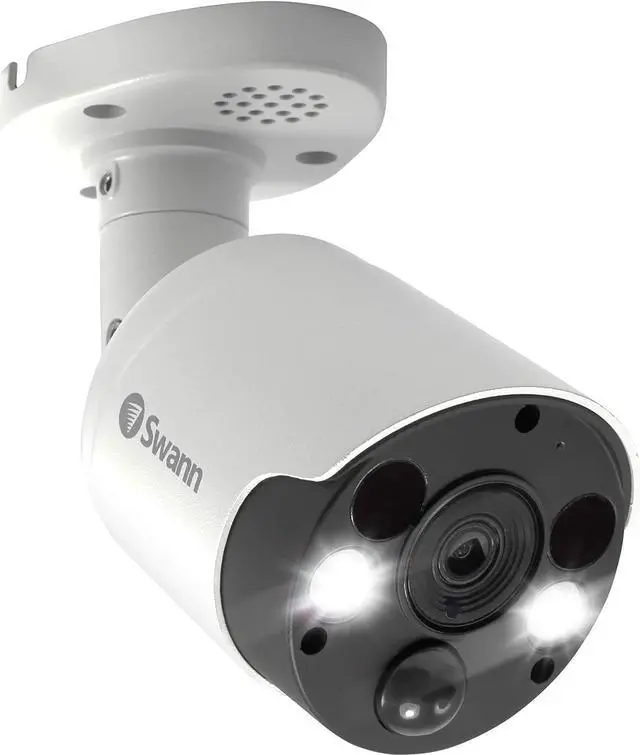 Packed with crime prevention features this 4K Ultra HD IP Security camera is the perfect addition to your Swann NVR-8680 or NVR-8580 to cover blind spots. Get security evidence in 4K Ultra HD. Zoom in to essential evidence such as license plates & faces, while night vision keeps your property protected 24/7. The camera turns the lights on & trigger recording when it detects heat. The 2-way audio & siren let you talk back & scare off intruders. Audio capture adds another layer of evidence and lets you hear off-screen noises and identify voices by age, gender, accent & Language.