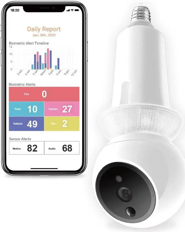 Zeus is the biometric indoor security camera designed to screw into a light socket for easy and no-fuss installation. Youll never miss a moment with Zeus 360° auto tracking that can detect moving objects to eliminate blind spots and the need for multiple cameras. From the free smartphone app, you can live stream, review footage and upgrade your subscription plan to unlock biometric features such as fire, human, vehicle and pet recognition. Comes with 1 year free Amaryllo Protect 30-Day continuous video recording plan to help save every moment recorded in the camera to the cloud.