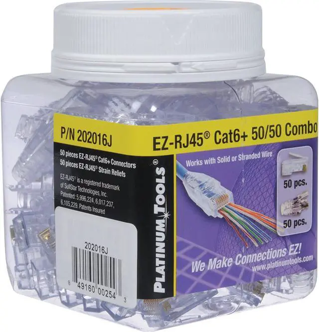 If you're seeking a comprehensive solution for your networking needs, look no further than the Platinum Tools EZ-RJ45 Cat 6 Connectors and Strain Relief Combo Kit. This all-in-one package, housed in a convenient jar, includes 50 high-quality EZ-RJ45 Cat 6 connectors and 50 strain reliefs, totaling 100 essential components for your Ethernet cable management.