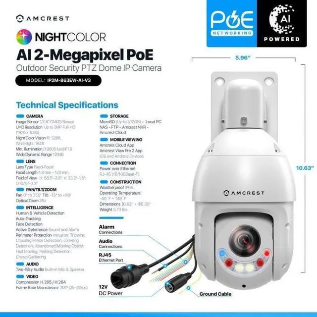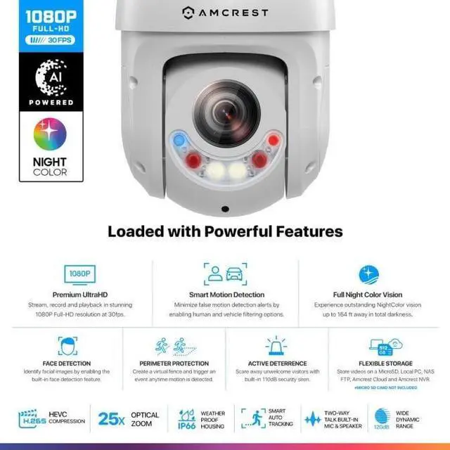Storage Options: MicroSD Card (Up to 512GB), Local PC, NAS System, Amcrest NVR & Amcrest Cloud