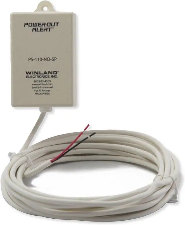 The POWER-OUT ALERT by Winland is a compact, easy-to-use monitor that simply plugs into any outlet on the (120 volt AC) circuit needed to be monitored. POWER-OUT ALERT has an attached 15 foot cord that wires into an existing alarm system, telephone dialer or other emergency equipment. When power to the monitored circuit is interrupted for more than 3 to 8 consecutive minutes, POWER-OUT ALERT activates the connected emergency equipment, providing prompt notification of a power outage. This sensor can be used with virtually any security/monitoring/home automation system that accepts a dry contact closure as a signal. Use it with the X10 Security System Wireless Transmitters, the JDS TimeCommander Plus, Sensaphone, etc. Contacts rated for 500mA at 30 Volts AC/DC.