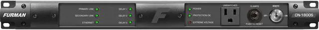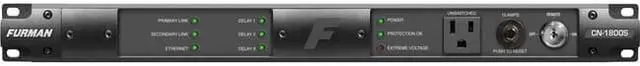 HTTP: connection, or Panamax/Furman’s BlueBOLT®-hosted remote power and energy management platform. Features at a Glance Surge Protection - Series Multi-Stage Protection (SMP) Technology provides the highest level of surge & spike protection available. Noise Filtration - Linear Filtration Technology (LiFT) reduces AC noise linearly across a very wide bandwidth for unequaled audio & video clarity. Voltage Protection - Extreme Voltage Shutdown (EVS) circuity safely powers down itself and connected equipment during unsafe voltage periods. SmartSequencing™ - SmartSequencing allows bidirectional, safe sequenced power up/down operations via the push of a button or turn of a key. Diagnostic Lights - Diagnostic lights provide valuable system information including power quality, “Protectection Ok” indicator, and Extreme Voltage indicator. 15 Amp Output Current - 15 amp maximum current capacity with incorporated 15 amp thermal circuit breaker. Remote Access (RS-232) - RS-232 compatibility & command set provide integration with control systems, open source and control programming. BlueBOLT Compatible® - BlueBOLT provides remote access to reboot components, power equipemnt on/off, and monitor power quality via the internet from anywhere in the world. Nine Total Outlets - The CN-1800S contains eight rear panel NEMA 5-15R outlets and one front panel NEMA 5-15R outlet.
