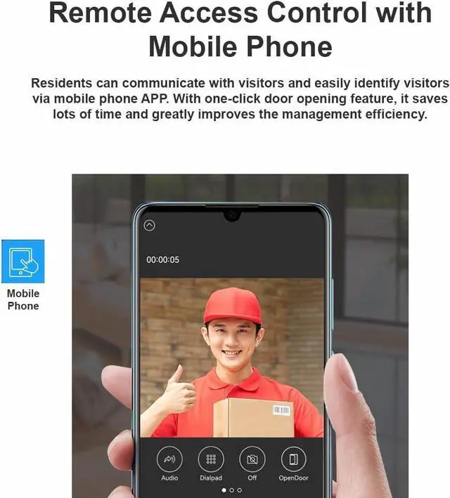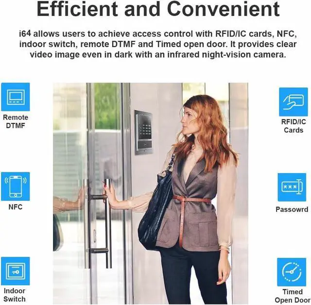 Support to open the door with password, RFID/IC cards, NFC, indoor switch, remote DTMF, Timed open door