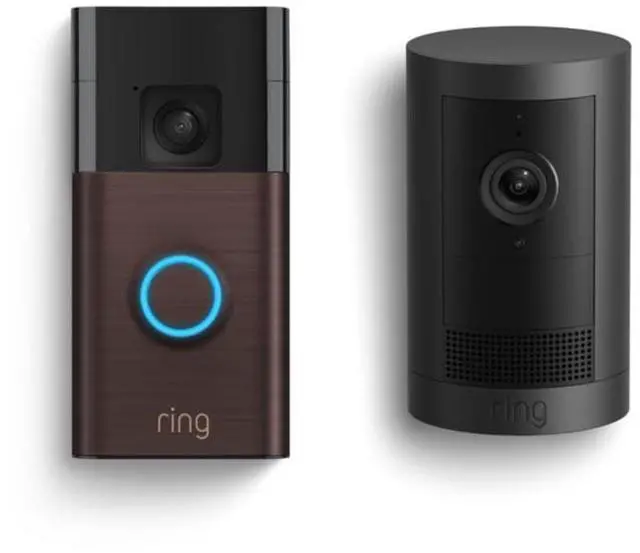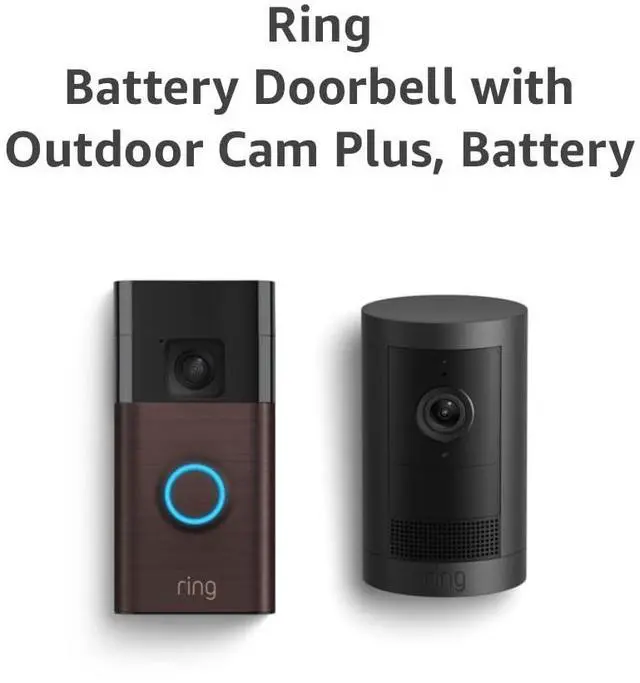 This bundle contains Ring Battery Doorbell (Venetian Bronze) and Ring Outdoor Cam Plus, Battery (Black).