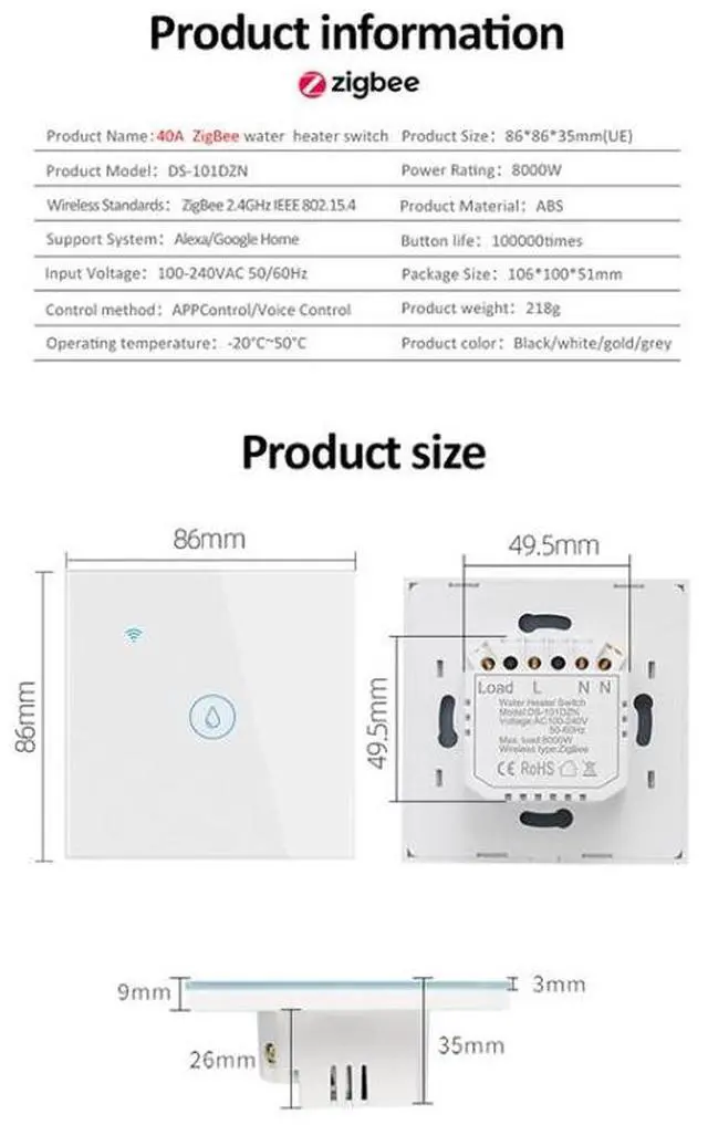 Tuya ZigBee 40A Smart High Power Water Heater Light Air Conditioner Switch Time Voice Remote Control ZigBee 40A White (White)