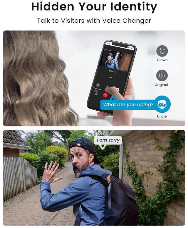 2-way Audio & Voice Message: The wifi doorbell camera allows you see, hear and talk to visitors at any time. Imagine how much fun it would be to scare away strangers at the door with a strong male voice or play a lighthearted joke with your children with a clown voice. You can also choose pre-recorded voice messages (up to 3) to quickly reply when you are busy. Ideal protection and gift for the elderly, children and people living alone