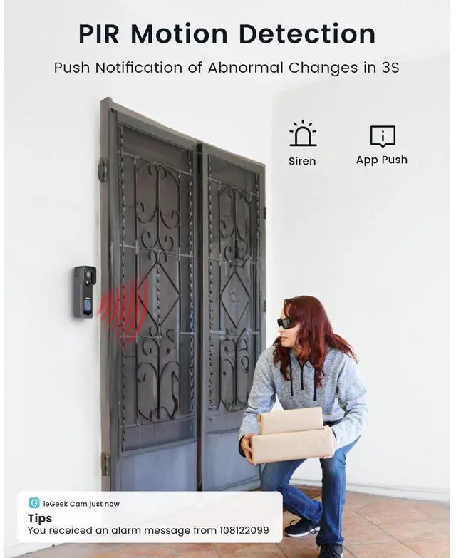 5MP & 166° Range: ieGeek doorbell camera wireless has an upgraded 5MP lens and 166° viewing angle, allowing you to get clear and sharp images even in low light conditions. No more package missing, no more guys missing, no more action missing.