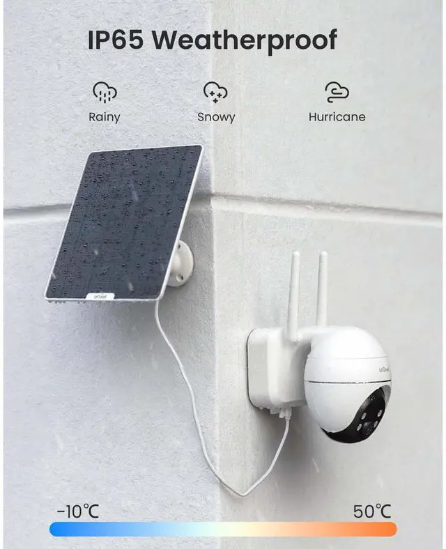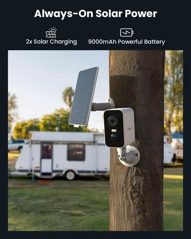 Year-Round Solar Energ  Keep your security powered by solar energy all year. The built-in 9000mAh battery ensures the camera keeps running even on cloudy days or during periods without sunlight. Enjoy completely wire-free installation and continuous, worry-free protection.