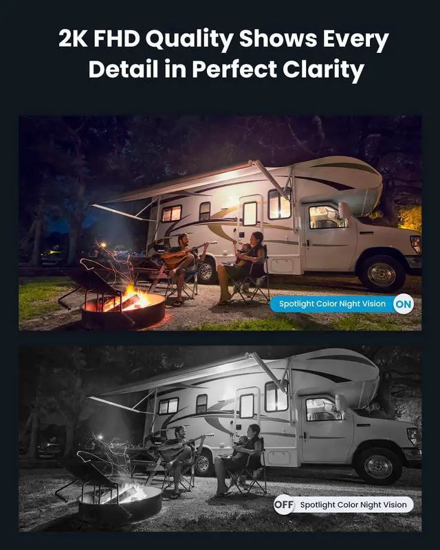 Crystal-Clear 2K with Full-Color Night Vision  See every detail, day or night. 2K FHD resolution, built-in spotlight, and color night vision ensure sharp, realistic footage. With 300° pan and 90° tilt, you'll cover every angle without blind spots.