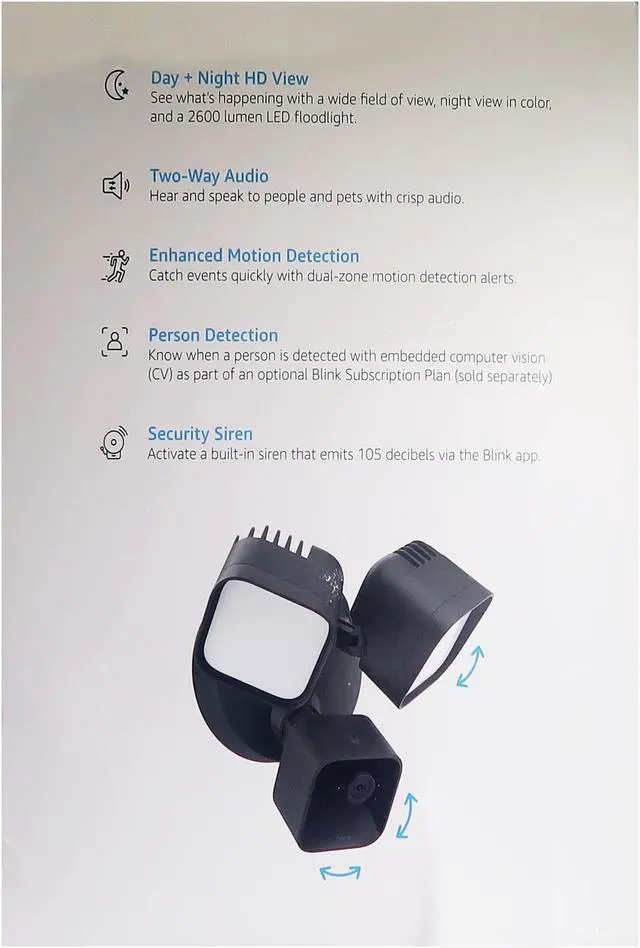 Blink Wired Floodlight Camera Smart security camera, 2600 lumens, HD live view, enhanced motion detection, built-in siren, Works with Alexa 1 camera (Black)Help protect your home with 2600 lumens of powerful LED lighting, enhanced motion detection, night view in color, crisp two-way audio, and more. Use the Blink app to see and speak to people and pets no matter where you are day or night. It also works with Alexa.