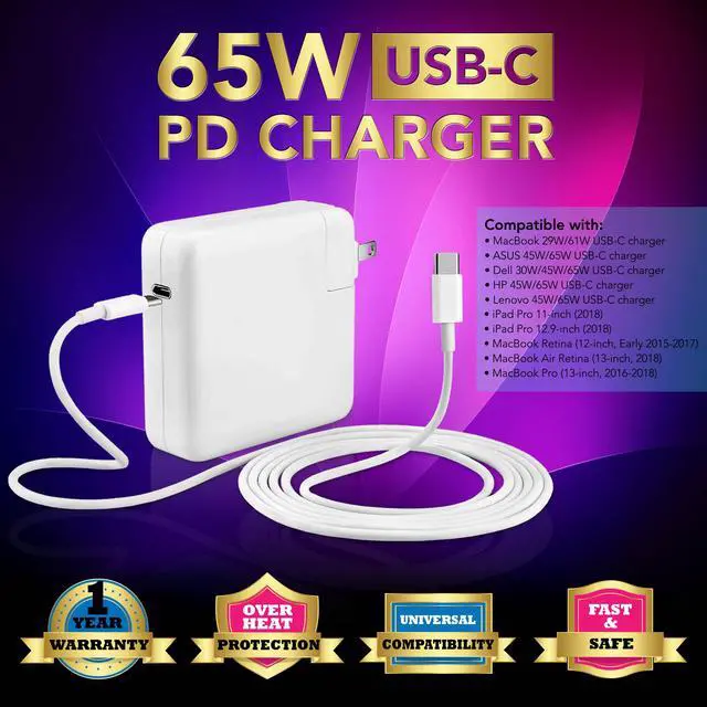 Great Replacement Up to 65W Charger for Apple MacBook/Pro, Lenovo, ASUS, Acer, Dell, Xiaomi Air, Huawei Matebook, HP Spectre, Thinkpad, Razer, Google, LG, New Nokia N1 tablet and Any Other Laptops or Smart Phones with the USB C