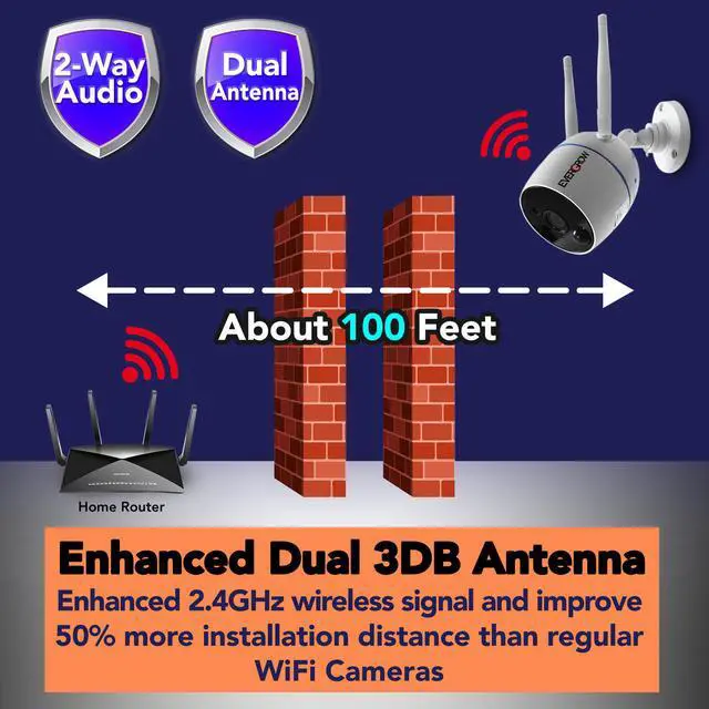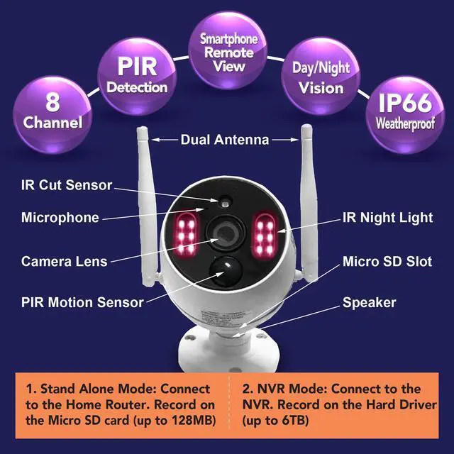 Our H.265+ 1296p Wireless CCTV Camera system supports 8+N cameras. In the NVR mode, up to 10 cameras can be connected to the NVR. In the Standalone mode, N cameras can be connected to the home/office router. By using the wifi range extender(not included) and build in powerful dual antenna, our Wireless Camera System can reach 150% more area. This is NOT short range Battery Powered Camera. All the cameras needed to be plugged into the power outlet to transmit the signal as far as possible.