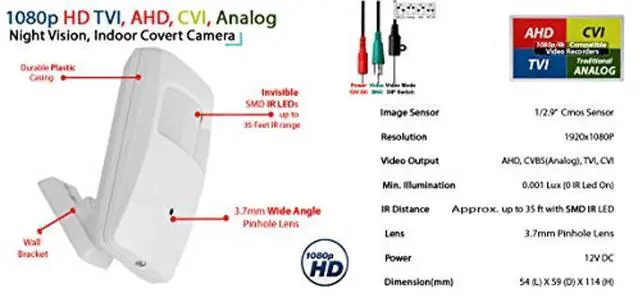 ONPackage Includes: 1080p HD TVI, CVI, AHD and Analog, Indoor, 3.7 mm Pinhole Wide Angle, Motion Detector Style Hidden Security CameraTechnical Spec. 4x Screws 4x Plastic wall anchorsRelated