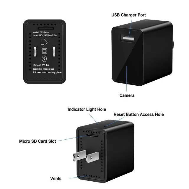 WAY1: Directly Inserted a Micro SD Card into this USB charger camera, and plug this mini camera into an outlet, then this small camera charger will automatically record videos to the SD card.