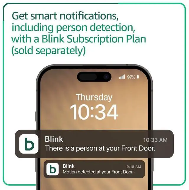 Always know who's there As part of a Blink Subscription Plan (sold separately), get alerts whenever a person is detected and enjoy features like Blink Moments, which stitches together clips into a single video to save and share.