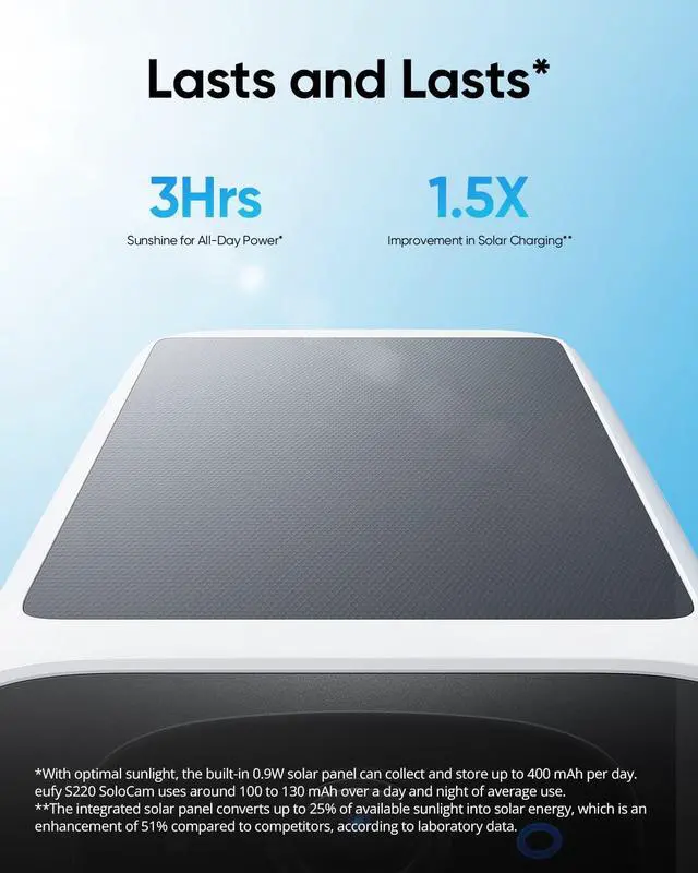 * With optimal sunlight, the built-in 0.9W solar panel can collect and store 200 to 400 mAh per day. eufy SoloCam S220 uses 100 to 130 mAh over a day and night of average use.
