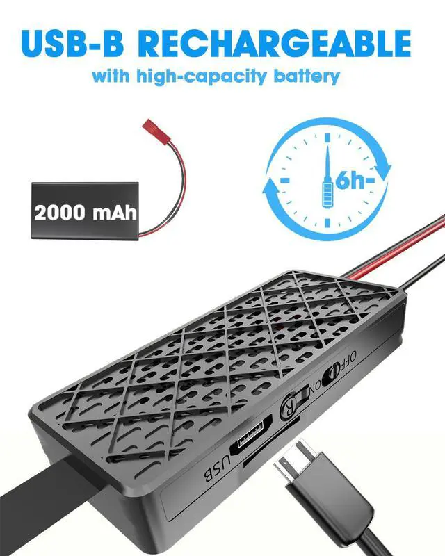 Two Power Supply Methods: 1) It can support the camera continuous recording for more than 6h & the standby time exceeds 30h. 2) Connect the power for continuous recording.