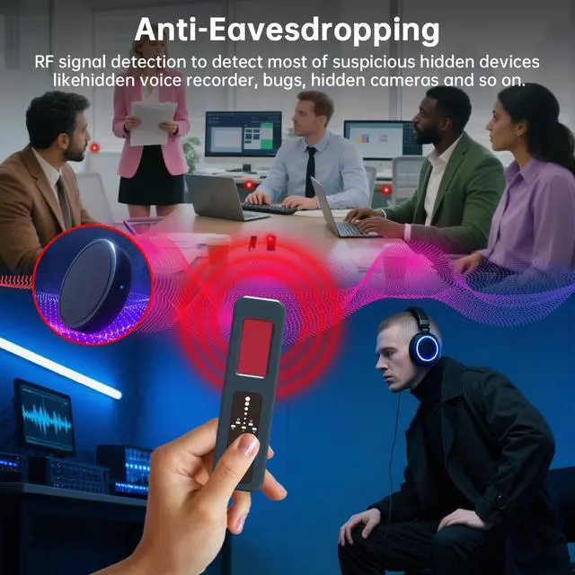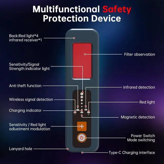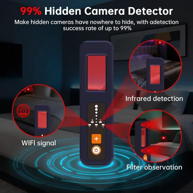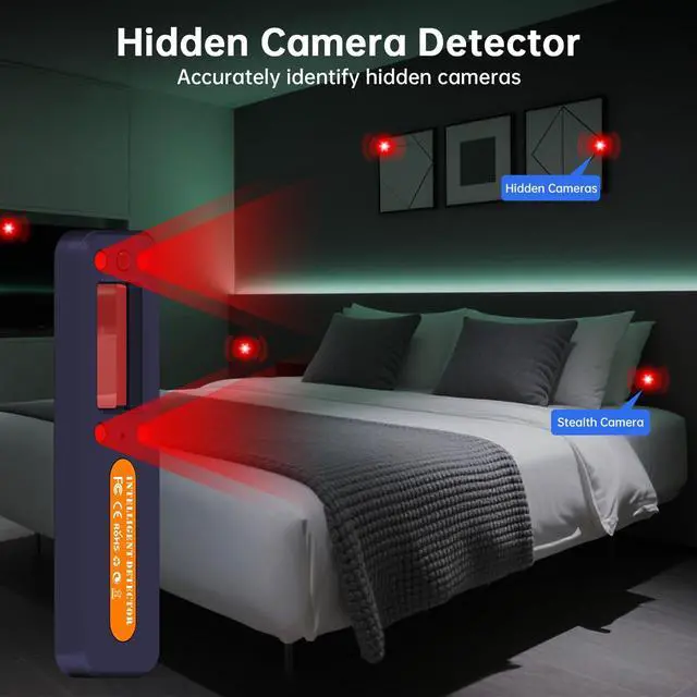 Comprehensive Privacy ProtectionOur hidden camera detector uses passive infrared scanning technology.When travelling,use this detector to scan your surroundings in hotels and other places you visit.The laser scans your surroundings while your eyes look through the special filters attached to the detector.If there is a hidden camera in front of you,be able to accurately detect it.The camera detector pinpoints 5.8 GHz wireless cameras in hotels,cars and offices.