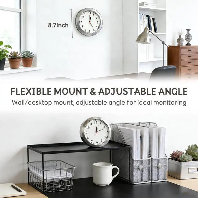 Dual-Function & Flexible Angle: 8.7-inch circular clock design (AA battery req., not included); wall/desktop placement, adjustable camera viewing angle to fit your monitoring needs perfectly, seamlessly combining security monitoring and a functional clock.