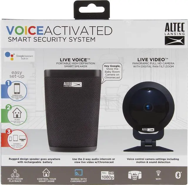 The Altec Lansing Voice Activated Smart Security System bundle features 2 world class products to protect your home- a Google portable speaker and a panoramic full HD camera. The Google Live speaker is a sleek voice activated speaker with Wi-Fi and Bluetooth enabled that delivers immersive stereo sound. With Google Assistant built-in never be without answers to your questions. It's your own personal Google, always ready to help - ask it questions, tell it to do things, the more you use it, the more useful it gets! The Live Camera records 360 degree clear images during the day or night in full HD resolution. With digital pan-tilt-zoom, two way intercom, and motion detection, this smart home bundle is the perfect smart home starter kit.