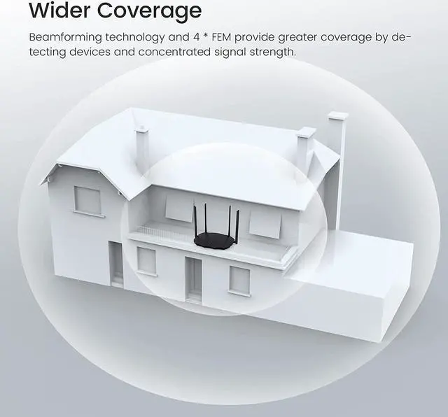 Dedicated Strong Signal for Reliable Network: With 4 independent FEMs and 4*external dual-band 6dBi omnidirectional antennas, RX9 fully improves signal power and receiving sensitivity, and achieves Wi-Fi 6 signal coverage for small and medium-sized houses.