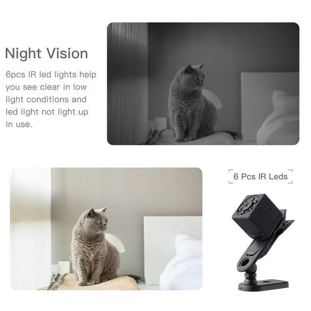 - 1080P resolution. Gets a high quality image, And this hidden cam has 6 pcs infrared night vision lights supports recording videos and take photos in low light.