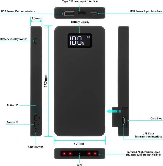 This mini hidden cameras provides 1920 * 1080P Full HD picture quality. You can take the portable spy camera anywhere, no one will realize that this is a camera. Built-in 10000mAh lithium polymer battery, can support 50 hours of recording time when fully charged.